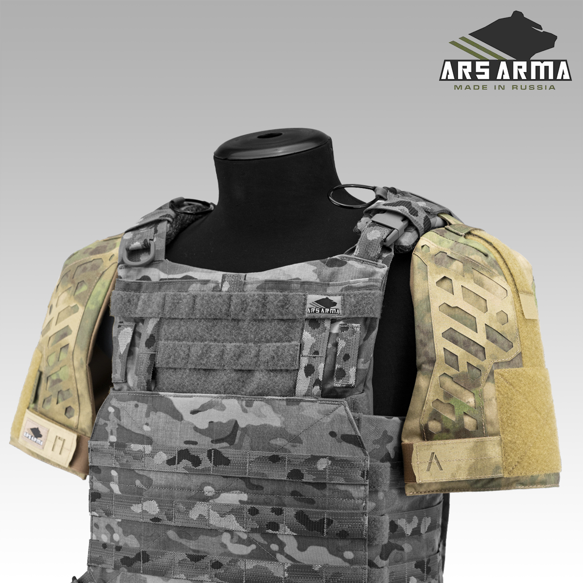 Ламинированные элементы снаружи защиты плеч придают фактуру, которая помогает разбить силуэт и одновременно с этим могут служить для закрепления элементов маскировки, например, 3Д сетки. Велкро на внешней стороне можно использовать для размещения ведомственных и других патчей.