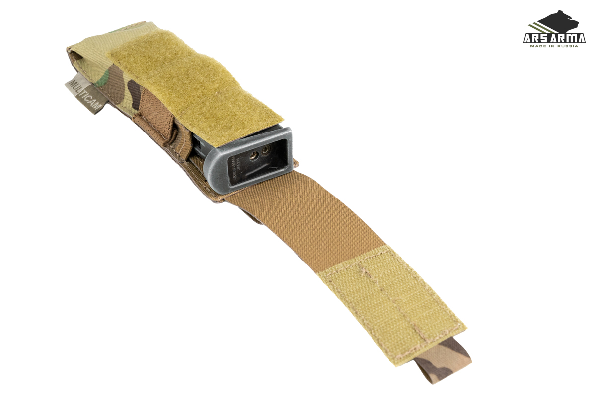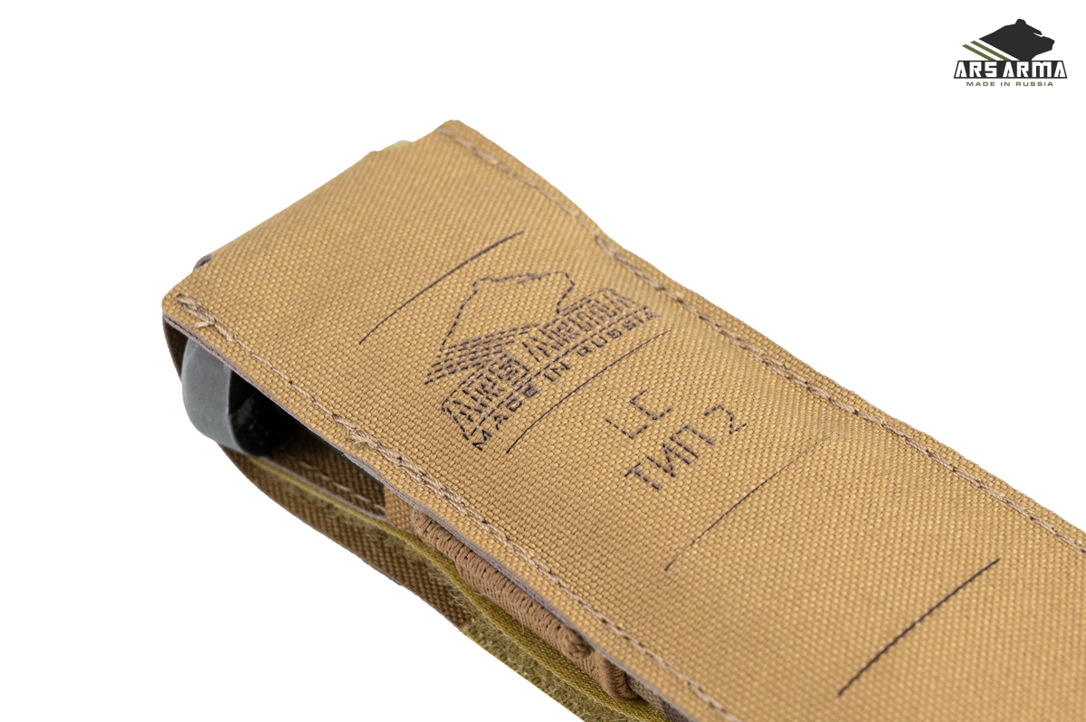Подсумок предназначен для переноски пистолетных магазинов, мультитула, фонаря. Фиксация содержимого осуществляется за счет регулируемого по высоте клапана с велкро, для лучшего удержания присутствует резинка, которая позволяет использовать подсумок с открытым клапаном для быстрого доступа к пистолетным магазинам.
