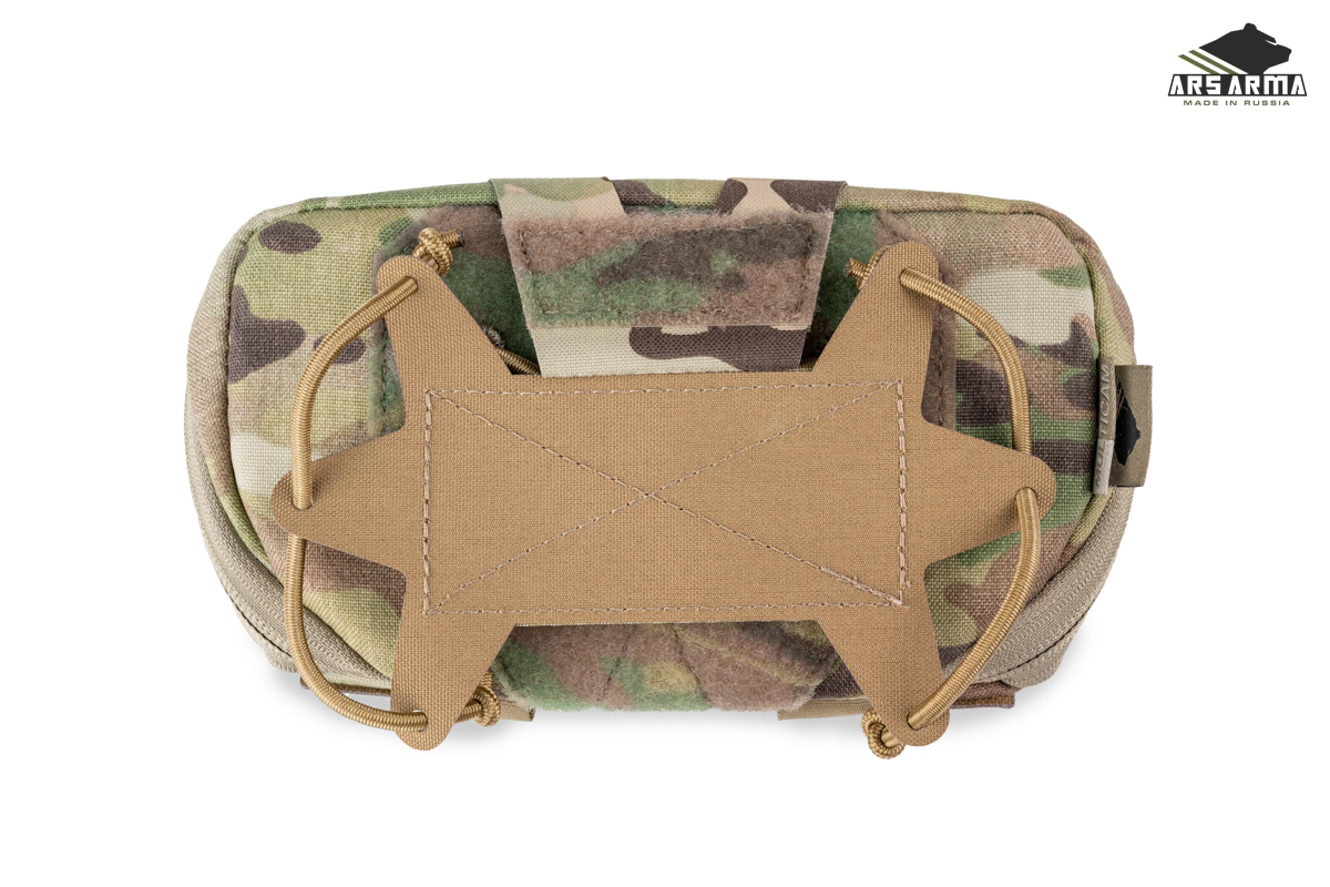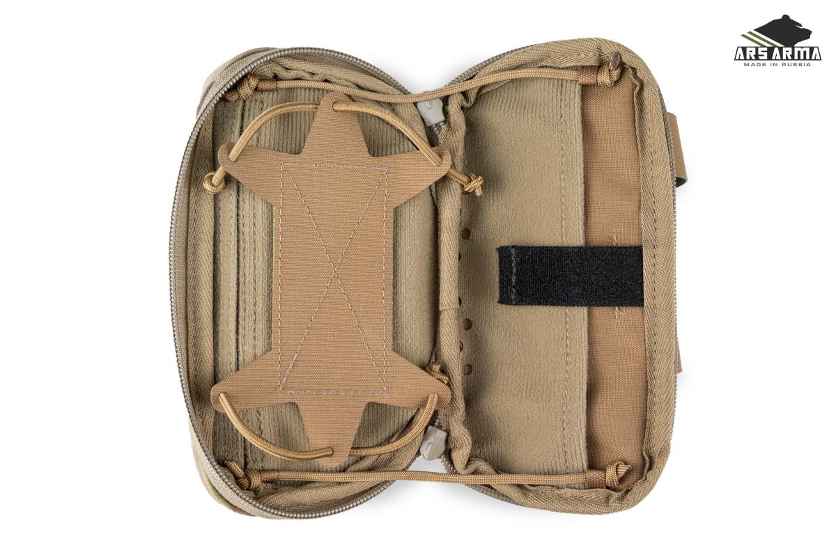 Подсумок оснащен страховочным клапаном на молнии и возможностью быстрого закрытия. Угол открытия регулируется, а внутренняя съемная панель позволяет зафиксировать телефон любого размера. Дополнительные элементы включают петли из шнура для крепления снаряжения, например, турникета и плоский карман на липучке для документов.
